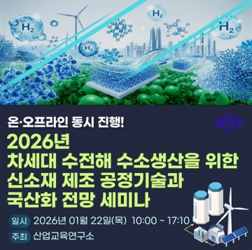 이러한 시기에 산업교육연구소(https://www.kiei.com)는 1월 22일(목)에 “2026년 차세대 수전해 수소생산을 위한 신소재 제조 공정기술과 국산화 전망 세미나”를 온·오프라인 동시 개최한다고 밝혔다.
