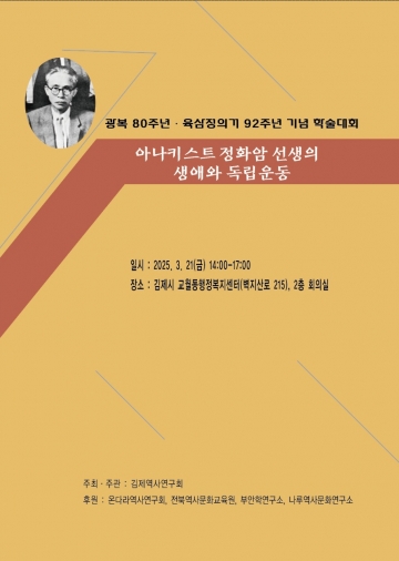 김제역사연구회는 3월21일 금요일 오후 2시 김제시 교월동 행정복지센터 2층 회의실에서 광복 80주년·육삼정의거 92주년 기념 정화암 학술대회를 개최한다.아나키스트 정화암 선생의 생애와 독립운동을 처음으로 조명하는 자리다.
