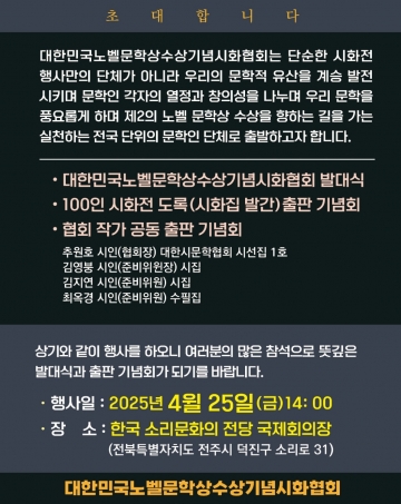 오는 25일 금요일 오후 2시 대한민국 노벨문학상 수상기념 시화협회( 회장 추원호, 추진위원장 정현덕, 준비위원장 김영붕, 운영위원장 홍성학)은 전주 한국소리문화의 전당 국제회의장에서 대한민국 최초 노벨문학상 수상기념 100인 시화전 도록 출판기념회가 개최된다.