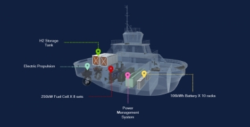 예인선은 총 3MW급 출력(1.5MW × 2)의 전기추진 체계를 기반으로 250kW급 수소연료전지 8기와 100kWh급 배터리 10기로 구성된 하이브리드 전력 시스템이 적용됐다. 연료전지는 안정적인 기저 출력을 담당하고, 배터리는 급격한 부하 변동에 대응하는 구조로 설계됐다. 특히 고방전율(High C-rate) 배터리를 적용해 고부하 대응 성능과 운항 안정성을 확보했다. 또한 연료전지–배터리–전력관리시스템(PMS)을 통합한 하이브리드 아키텍처를 통해 에너지 효율과 시스템 안정성을 동시에 확보한 것이 특징이다. 아울러 1.5MW급 림 구동 추진장치(Rim-Driven Thruster, RDT)가 적용돼 기계식 축계 없이 추진 효율과 정숙성을 동시에 확보했다.